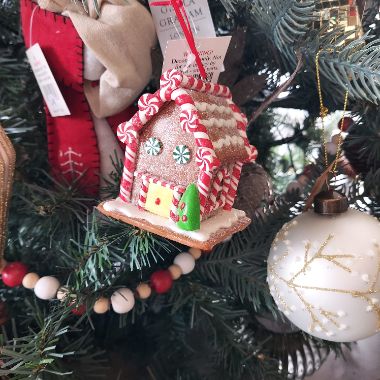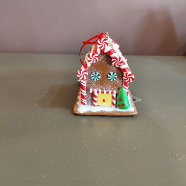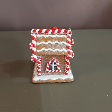 A cute little gingerbread house to hang on your tree. The house includes a battery powered LED light. Battery: LR44 x 3, not included. Dimensions: 7.5cm tall x 6.5cm x 6.5cm