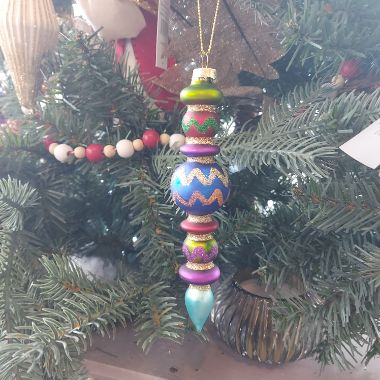In shades of green and blue with gold encrusted bands and zig-zags pattern.