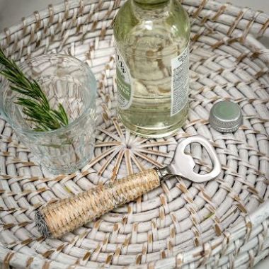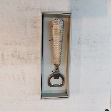Stainless steel bottle opener with wooden handle covered in ivory rattan presented in a lovely hard board recyclable gift box.