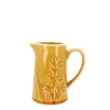 This lovely stoneware jug features a mustard yellow glaze and an imprinted meadow floral design.