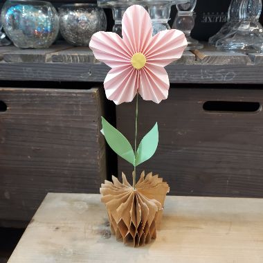 A paper honeycomb decoration of a flower with pink petals in a pot.