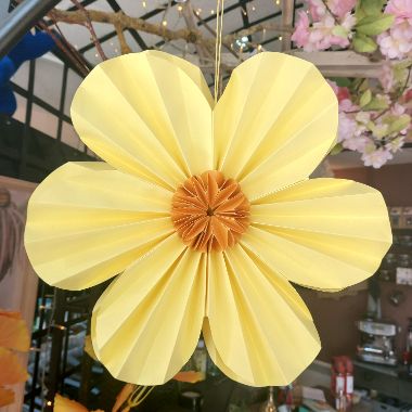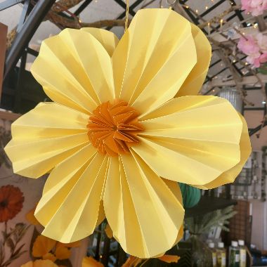 A paper flower head in yellow with a string so it can hang from a shelf, ceiling, or hang on a tree etc...
