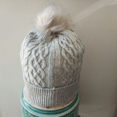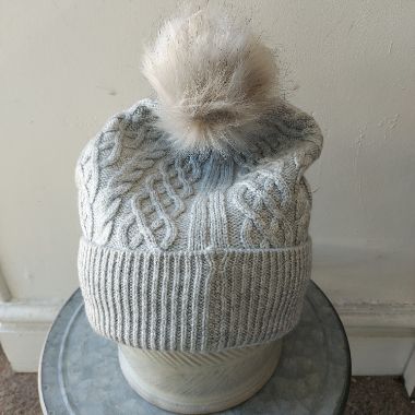 Grey cable knit bobble hat with lining