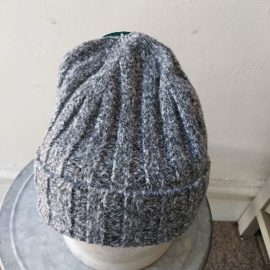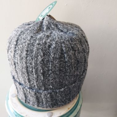 A lovely warm grey roll back beanie hat partially made from recycled materials