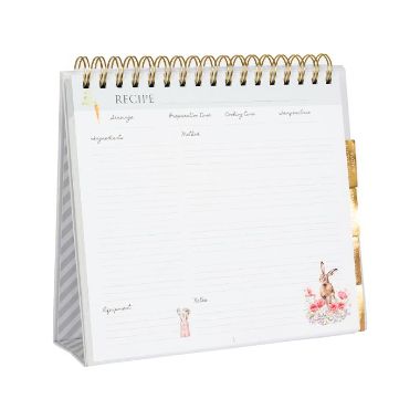 The book has a brushed gold spiral flip top design and built in stand that folds away for easy storage.