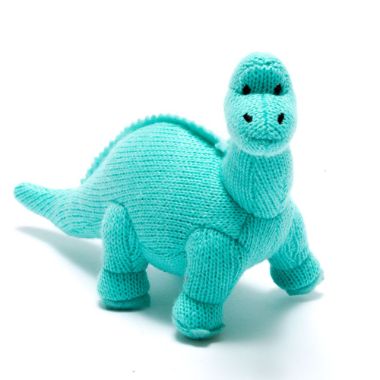 This small ice blue diplodocus knitted dinosaur rattle is ideal for babies and toddlers. This baby dinosaur teddy is the ideal size for little hands to play with and the gentle rattle sound is stimulating for your baby. Our baby dinosaur toys make ideal new baby gifts - the difficult decision is which one to choose! Approximate size: 18cm long x 15.5cm tall
