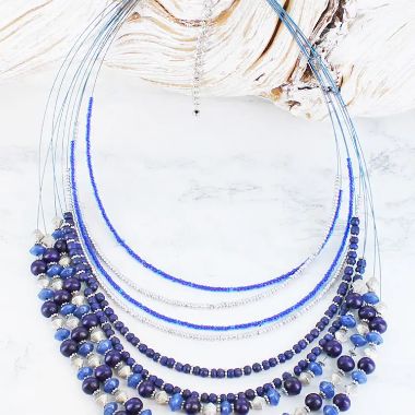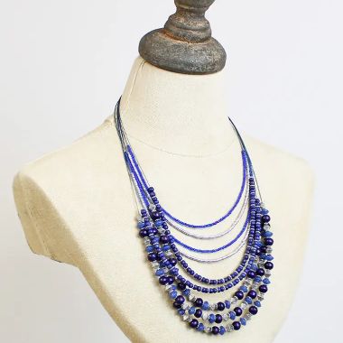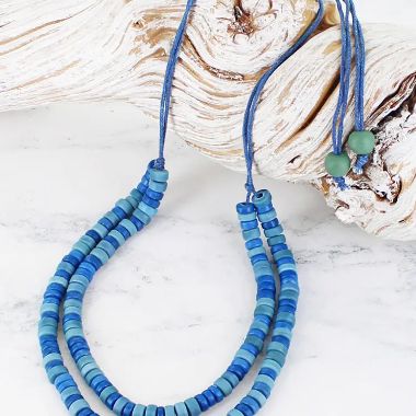 Double strand recyled glass bead necklace - blue