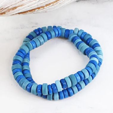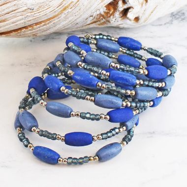 Elasticated double recycled glass bead bracelet - blue