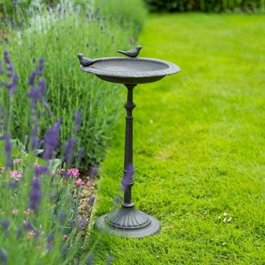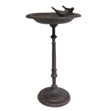 A beautiful cast iron bird table complete with two decorative birds and ornate detailing on the base, stem and bowl.