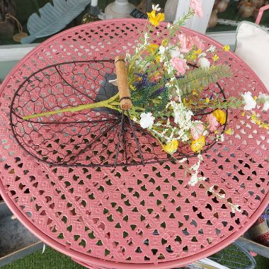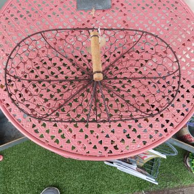 A lovely wire framed basket with a wooden handle.