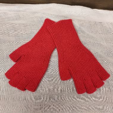 Beautiful fingerless gloves in red featuring a ribbed pattern.