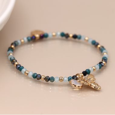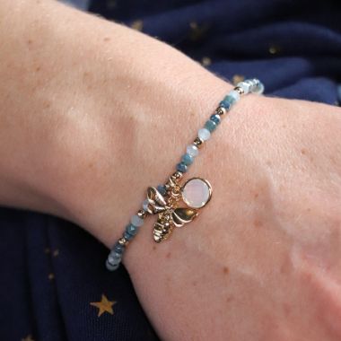 Blue bead bracelet with gold bee and crystal