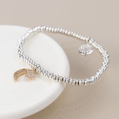 Silver plated stretch bracelet with flattened beads and faux gold plated crystal crescent moon and star charms