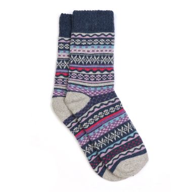 Denim blue mix Nordic inspired cosy socks with pink, lilac, grey and purple pattern