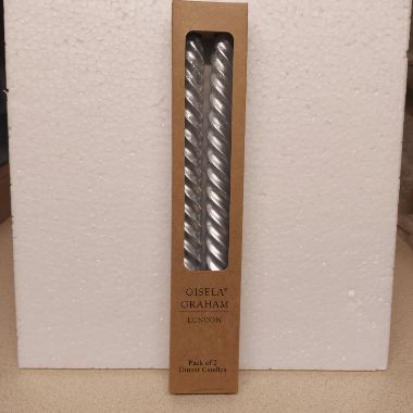 A luxury box of 2 metallic silver twist taper candles Set the perfect festive scene with the help of these candles Burn Time: 5.5 Hours Dimensions: 25cm x 9cm x 2cm Made from Paraffin Wax